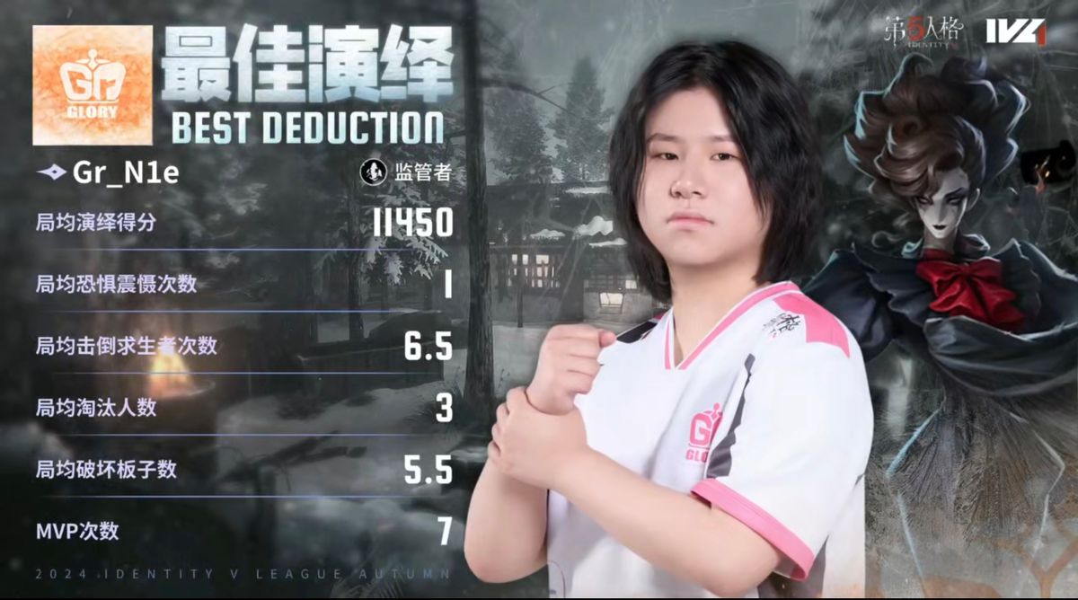 Gr的求生者选择了邮差、勘探员、火灾调查员、野人(BAN歌剧演员);Gr的监管者N1e选择了时空之影。(BAN空军、大副、先知、入殓师)