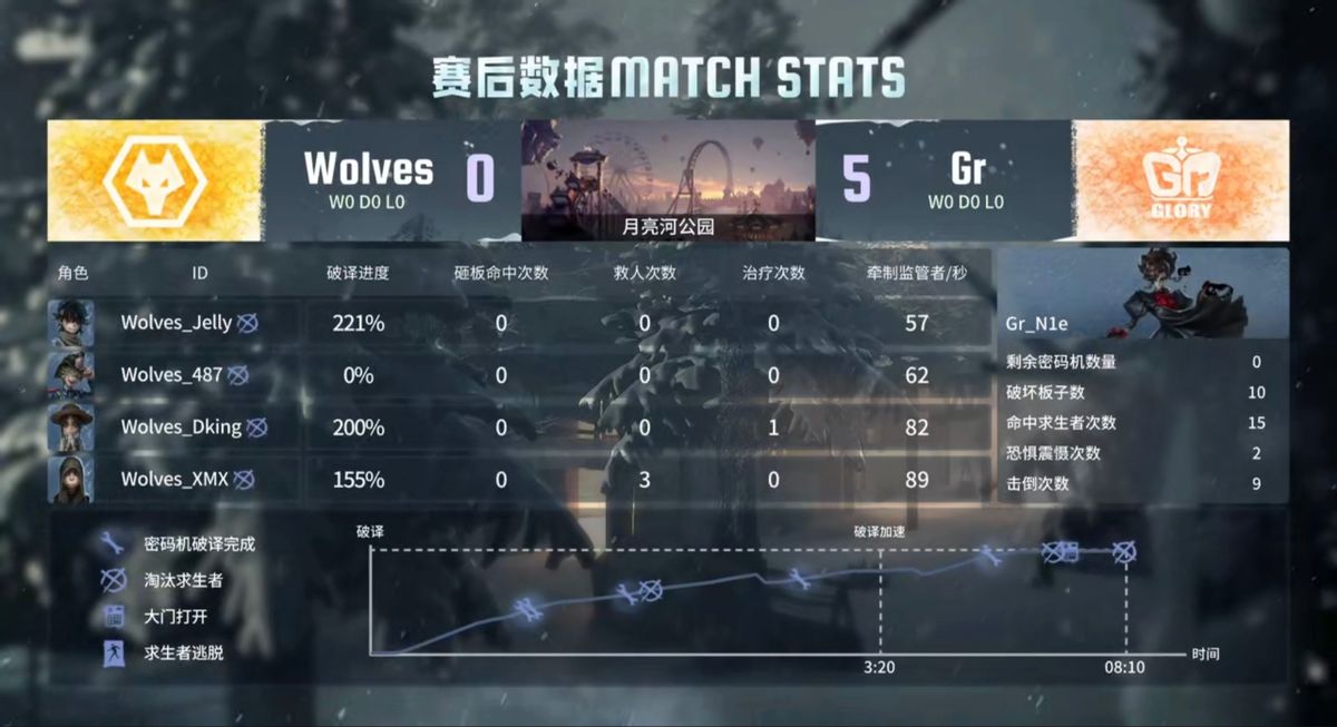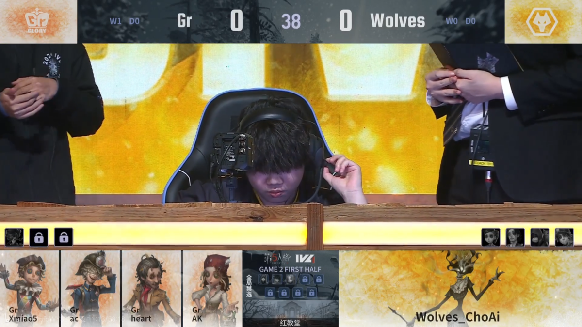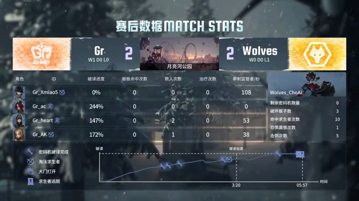 Gr的求生者选择了杂技演员、火灾调查员、野人、调酒师(BAN歌剧演员);成都Wolves的监管者ChoAi选择了时空之影。(BAN空军、大副、先知、勘探员)