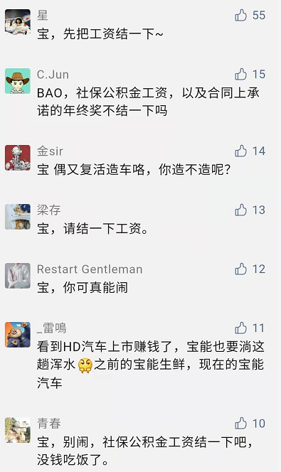 “宝,先把工资结算一下”、“宝,你可真能闹”、“宝,还我工资社保”……有才的网友甚至用“王思聪式”土味情话调侃道。据悉,这些“讨债”的网友大部分为宝能在职员工。也许是因为害怕被员工“追薪”,宝能汽车官方微信平台,无法在评论区留言。
