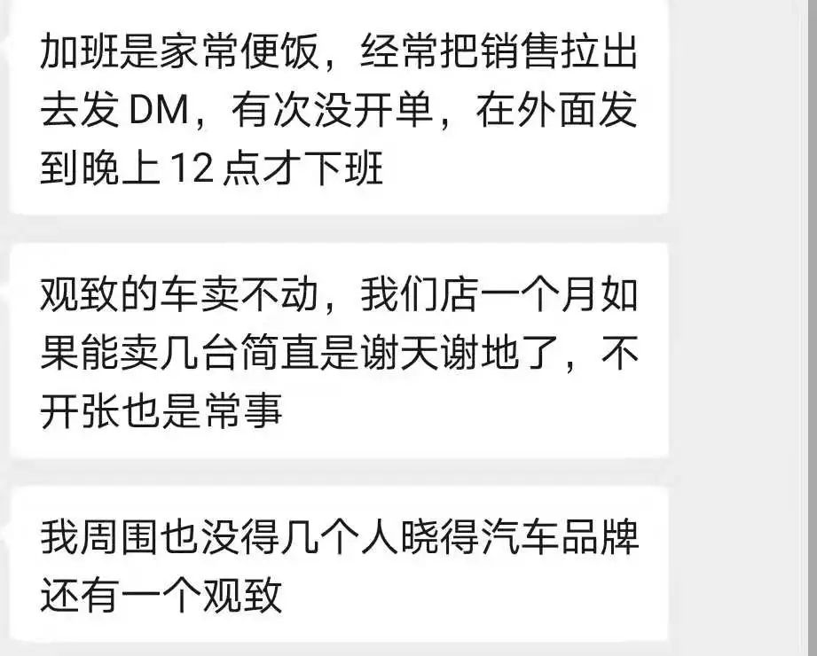 邵叶说,2021年初,宝能汽车就已经开始大规模裁员。“我怀疑他们是通过控制绩效、提成和补贴等,逼迫大家离职。本来观致的车就不好卖,好不容易卖出去1台,提成还压着不发。”工作不到两个月,邵叶就选择了离职。“之前有接近20个销售,我走后,我们那批销售也陆续离职了,现在大概只有3、4个人了。”
