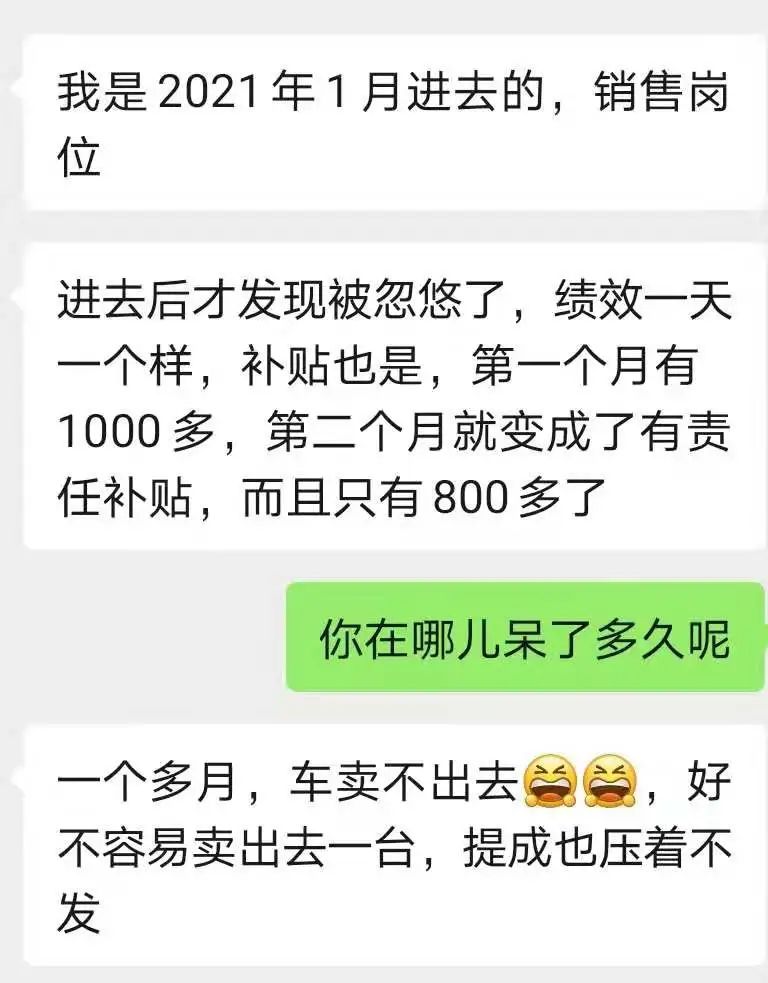 对于宝能的这些“骚操作”,邵叶(化名)深有感触。2021年1月,邵叶被宝能汽车的“高底薪、高提成”吸引,入职宝能汽车成都某直营店担任销售顾问。“进去后,才发现被忽悠了,工资和绩效并没有之前承诺的那么多。比如补贴,第一个月有1000多元补贴,第二个月就变成有责任补贴,只有800多了,第三个月更低。”