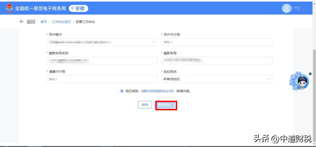 3.核对系统自动带出的信息,并填写开户行行号、清算行行号等必填信息后,点击【提交验证】,待系统显示保存成功即表示三方签订成功。