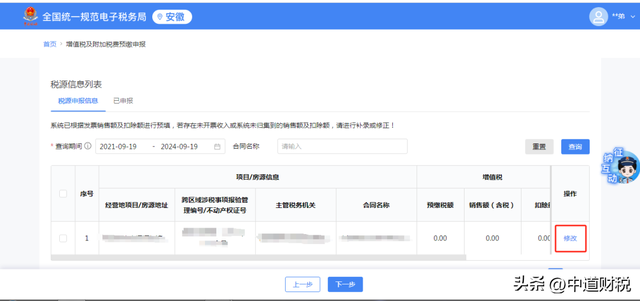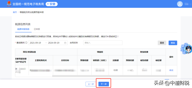 2.选择对应项目,点击【修改】,补录并核对增值税及附加税费明细,核对无误后点击【确定】,进入【下一步】。