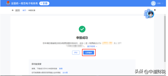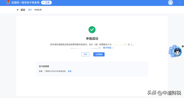 3.填写并核对申报信息后,点击【提交申报】进入申报确认,确认无误后点击【确定】即可成功申报,点击下方【立即缴款】按钮进入缴款界面。