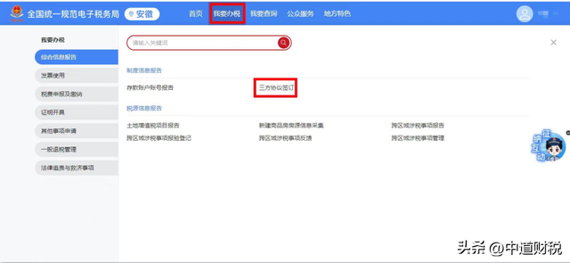 答:1.登录预缴地新电子税局,点击【我要办税】,在【制度信息报告】中找到【三方协议签订】,点击进入。