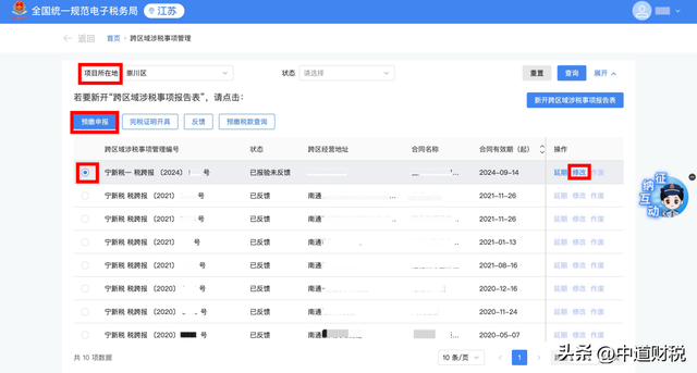 3.选择需要申报缴款的跨区域涉税事项,可点击【项目所在地】搜索,勾选对应的【跨区域涉税事项管理编号】,点击【预缴申报】,勾选对应项目,点击【修改】。