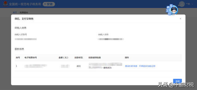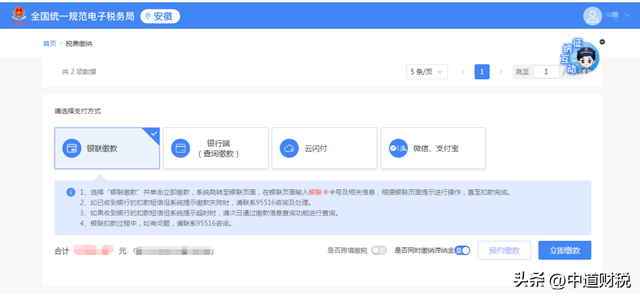 4.选择您方便的缴款方式,核对金额无误后点击【立即缴款】,扣款状态及扣款返回信息显示成功即表示缴款成功。