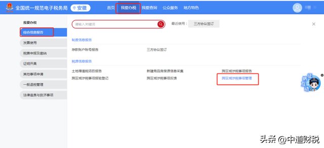 2.点击【我要办税】——【综合信息报告】——【跨区域涉税事项管理】。