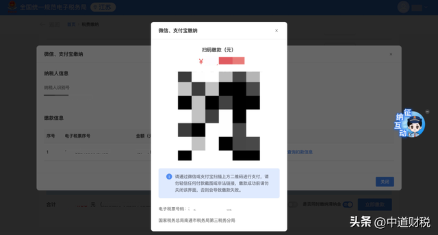 2.目前缴款方式支持银联缴款、云闪付以及微信、支付宝扫码支付。以“微信、支付宝缴纳”为例,点击【扣款】,弹窗弹跳出二维码,用微信、支付宝扫码支付即可。