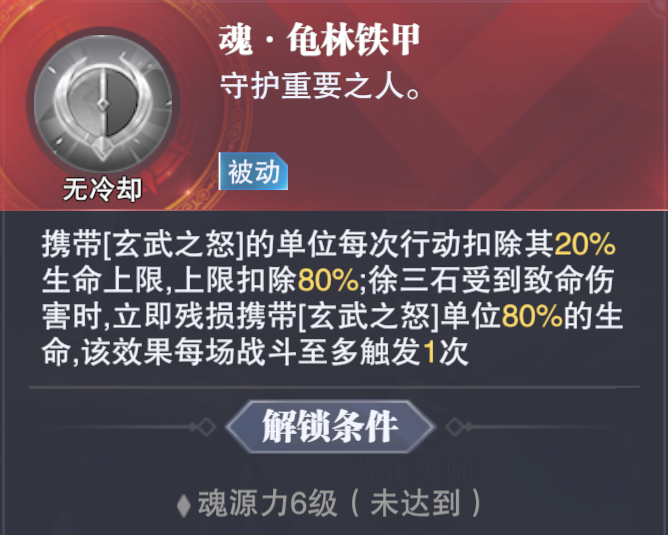 其次如果不想带一位具备长图回能的角色,则通过“黄金玄武”活动上线的徐三石第三块专属魂骨就非常重要了,因为它可以在我方行动的时候就给我方角色补2层“玄龟甲”,这就能很大程度上弥补徐三石技能释放频率不足或速度不够等问题造成的尴尬窘境,这两点还请大家注意即可