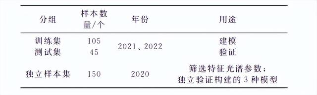 高光谱反射率的测定时间与植株含水量一致;即在苗期、块茎形成期、块茎膨大期、淀粉积累期和收获期各取一次样,随机选取八个点进行测定,每个点测定5个数据。高光谱数据的采集使用便携式,该仪器的光谱范围337~2521nm。在数据处理过程中,为了保证模型对马铃薯整个生育期的普适性,选择2020年全生育时期不同灌溉处理的试验数据筛选表征叶片含水量的特征光谱参数(波段、一阶导数、指数),以2021年—2022年块茎形成期不同灌溉处理下得到的试验数据建立该生育时期叶片含水量的监测模型。采用独立验证样本,将其实测值与模型预测值进行回归拟合,以验证模决定系数(R2)和均方根误差(RMSE)作为指标评价模型的预测能力和迁移性;综合建模和验证模精度检验结果,选择推荐最优估算模型。共提取300组高光谱数据以及与之对应的300个马铃薯冠层叶片含水量数据,将数据集以7:3比例划分为训练集和测试集,具体的样本划分结果如表1所示。