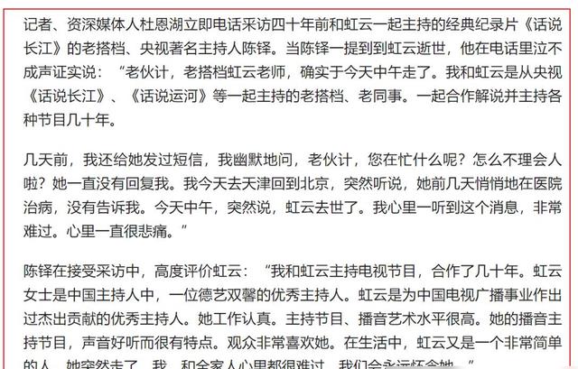 另一位老同事张泽群也在微博上表达了他的哀悼之情。他提到,“虹云总是那么专业,不管是在台上还是台下,总能给人以鼓舞。”对于一位主持人来说,专业素养是最基本也是最重要的,而虹云正是用她的一生证明了这一点。