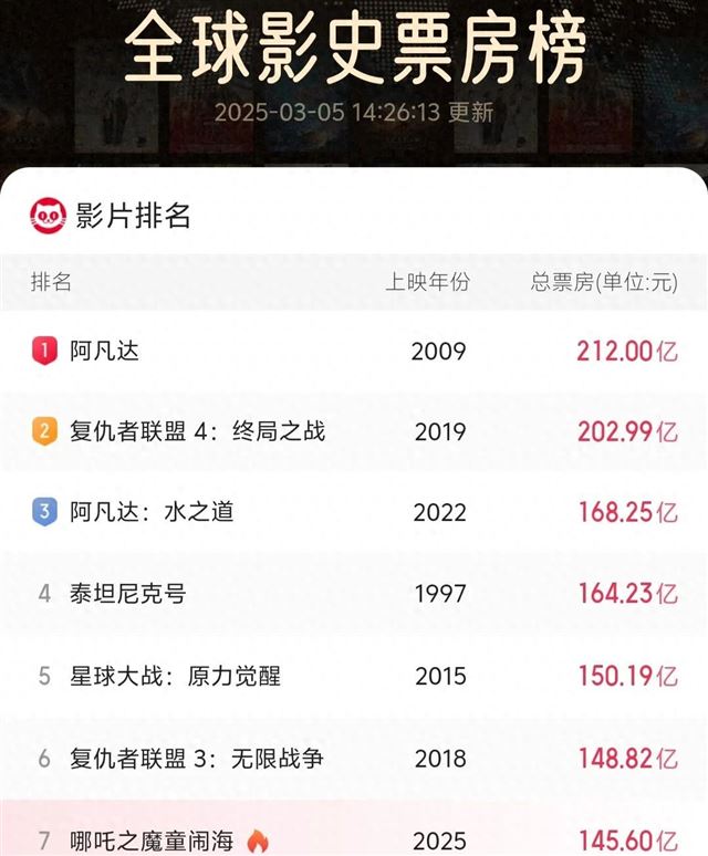 而《哪吒2》完全就是靠着国内一己之力把它抬上全球电影历史票房榜的。