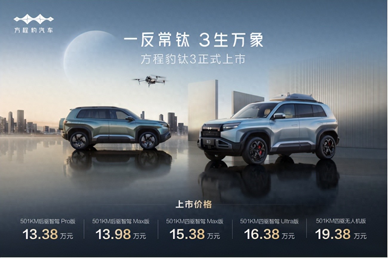 科技潮品,全民共享。方程豹钛3正式上市。用户可通过通过方程豹汽车APP、方程豹汽车微信小程序以及全国的线下门店下定购车。