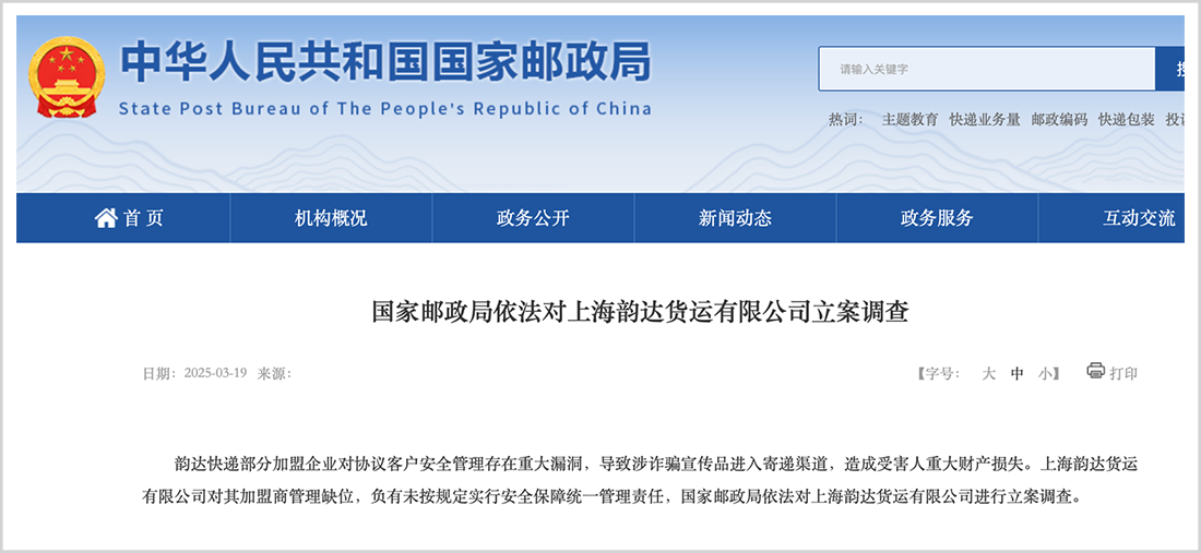 而上海韵达货运负有管理失职之责,该公司为韵达股份全资子公司。次日,韵达发布公告,称全力配合主管部门,立刻开展整改工作,提升对伪装物的识别能力。