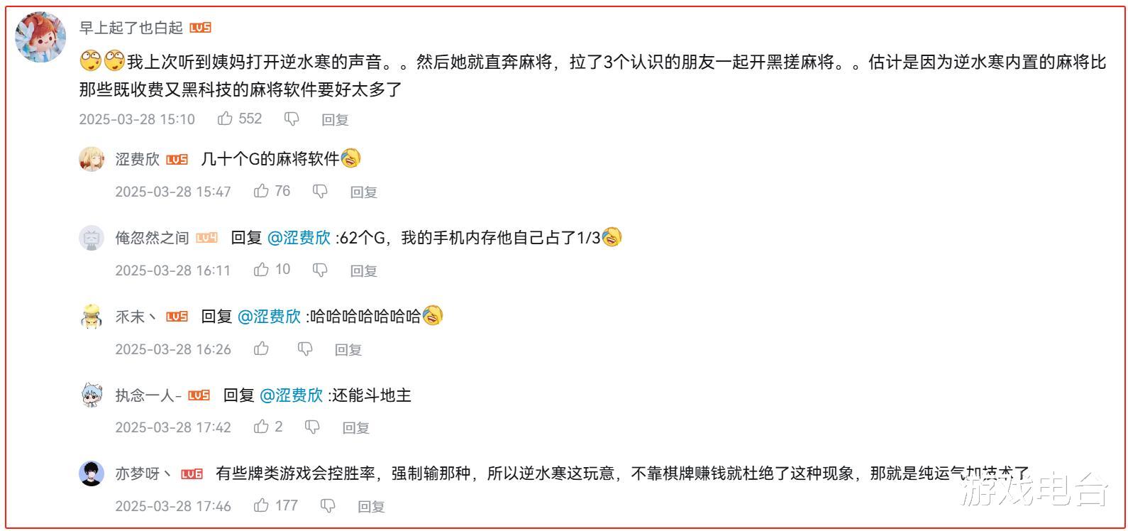 有玩家就表示,自己偶然发现了姨妈在《逆水寒》手游中跟朋友一起开黑搓麻将,询问之后才知道,对比市面上哪些既需要收费又可能有黑科技会强制控胜率的棋牌游戏,《逆水寒》手游的体验感好太多了,试过之后就成为唯一的“麻将软件”。