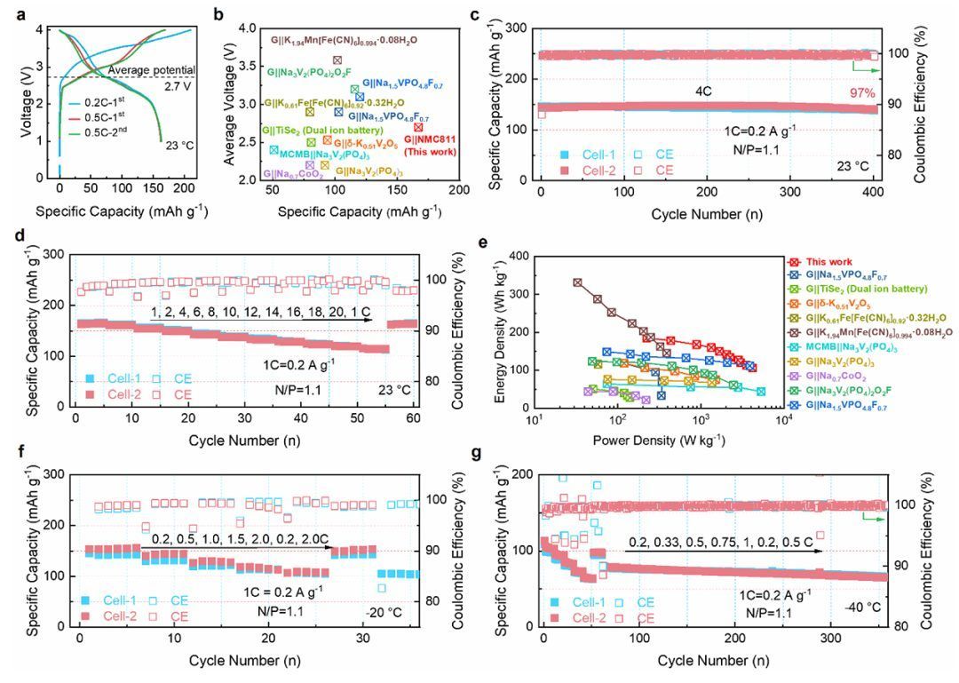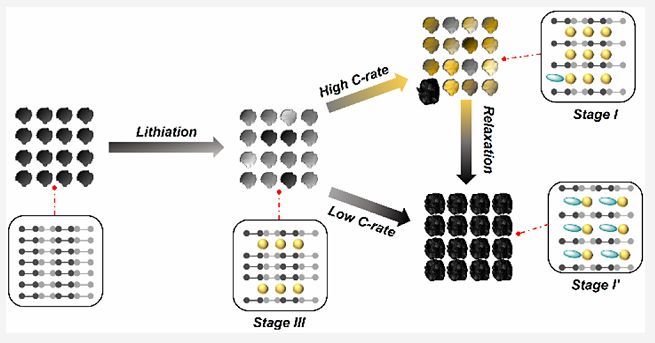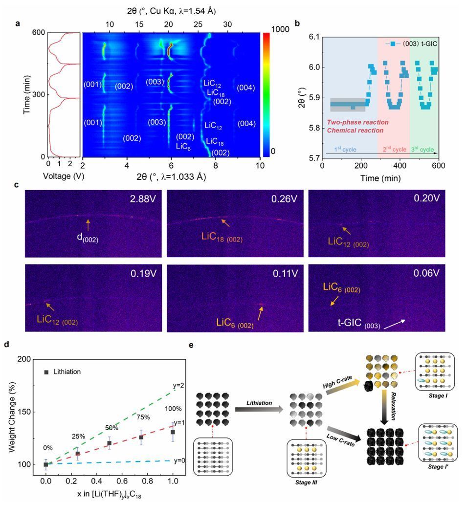 在此,弗吉尼亚理工大学林峰、Tao Lei等人报告了一种新颖的插层机制。即在初始石墨锂化过程中,通过二元GIC(b-GIC)和游离THF分子之间的自发、可控反应,在四氢呋喃(THF)电解质中原位合成t-GIC。由此产生的 t-GIC 化学消除了锂离子去溶剂化的必要性,即使在高电流密度下,也有利于石墨颗粒的快速动力学。因此,石墨负极表现出快速充电(1分钟)、无枝晶低温性能以及超过10000次循环的超长寿命。与分层正极相结合的全电池在充电 15 分钟后表现出卓越的循环稳定性,即使在 -40 °C 下也具有出色的倍率性能。