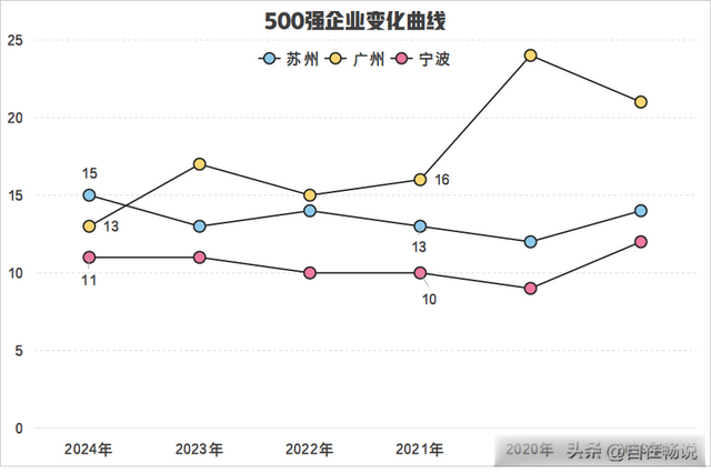 苏州&广州&宁波2024年,苏州首次超国广州,其500强企业总数达到15,虽然相比2021年只增加了2家,但是广州却减少了3家,只剩下13家。未来两年,广州还有可能被宁波追上。