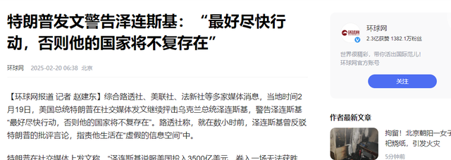 信源:特朗普发文警告泽连斯基:“最好尽快行动,否则他的国家将不复存在”2025-02-20环球网