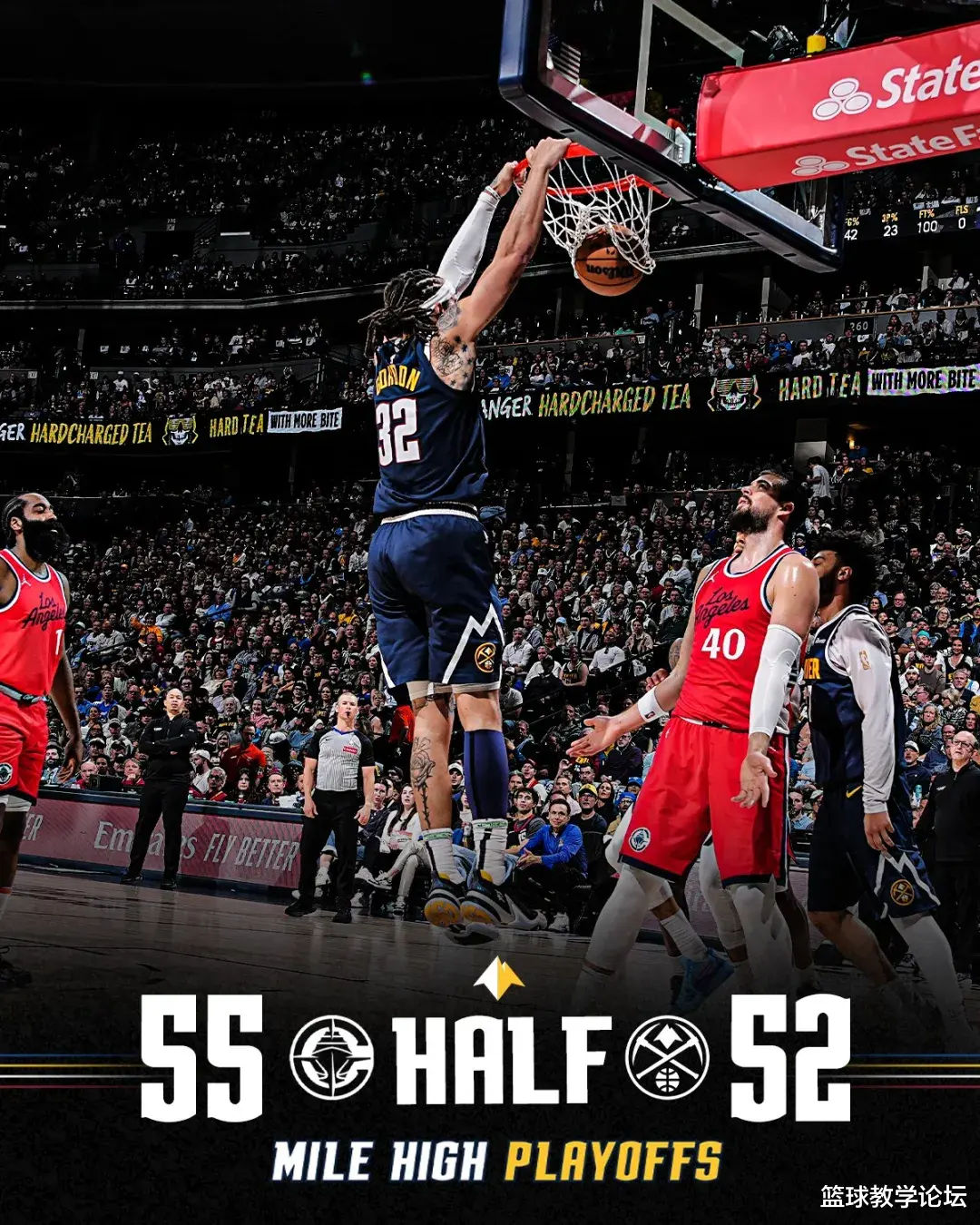 第二节后半段,哈登连得8分,小卡命中半场压哨三分。上半场结束,快船55比52领先3分。伦纳德10投9中砍下21分,季后赛超巨回来了!祖巴茨10分8板、哈登10分5助2帽;穆雷12分3助、小波特9分5板、约基奇8分4板5助2断!