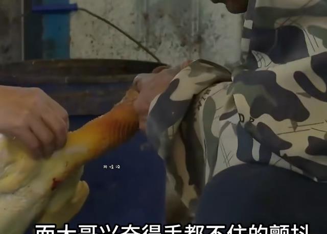 大爷处理鸡的时候,大姐连忙还要跟着一起帮忙,大爷不想让大妈弄脏了衣服服,表示自己就可以处理,但是大姐执意一定要搭把手,于是大爷就将自己的围裙给了大姐。