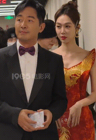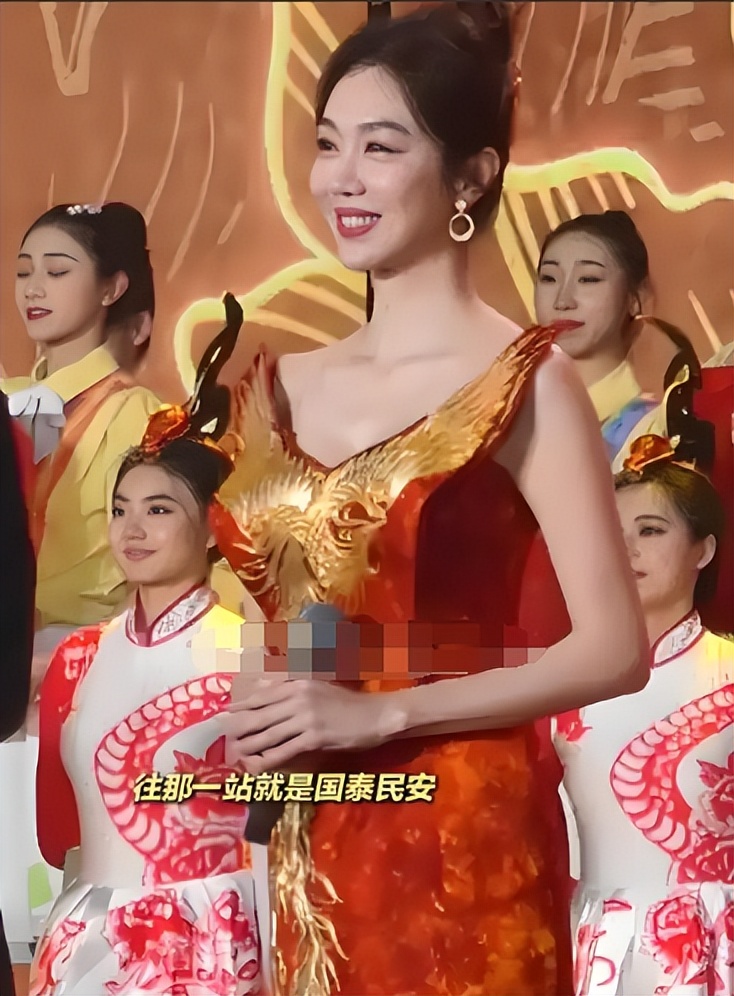 她身穿大红色的露肩长裙,一笑起来也是一张国泰民安的脸,脸上是满满的胶原蛋白。