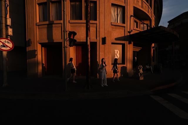 图六,远方的三件套和古建筑同框,那就等待一个时机按下快门吧。车里的人正在玩手机。骑行的人闯入了我的相机瞬间按下快门。在上海,由于人物和环境的原因,好像比其他城市街拍更容易得到满意的照片。
