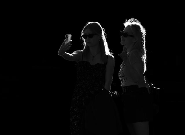 图三,夕阳下,外地游客正在合照留影。这束光刚好打在她们的发髻上非常靓丽。