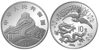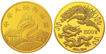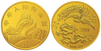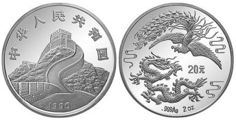1990版龙凤金银纪念币正面图案均为长城,并刊国名“中华人民共和国”和发行年号“1990”。背面图案均为龙凤吉祥图,并刊面额;其中20盎司圆形金质纪念币、2盎司圆形金质纪念币、20盎司圆形银质纪念币、2盎司圆形银质纪念币、1盎司圆形银质纪念币(精制币)刊有成色和对应的重量。龙凤金银币是我国贵金属纪念币发行历史上,发行的第一套2盎司规格的金银纪念币。开辟了2盎司金银纪念币的发行先河。