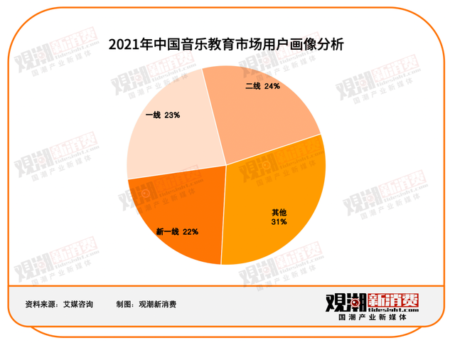 如此高昂的花费,决定了音乐,尤其是钢琴培训多数只会出现在高线城市。根据艾媒咨询数据,2021年中国音乐教育市场将近70%集中在一线、新一线和二线城市,在地区分布上也是超过60%的消费者集中在华东、华南和华北区域。在经济发展较好较快的地区,人均可支配收入普遍较高,消费结构优化,人们对教育的重视程度日益增加,对音乐教育的支出意愿和支出水平也会高于其他区域。