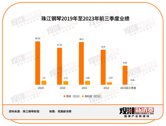 作为国产钢琴龙头企业的珠江钢琴,疫情前业绩还较为平稳,疫情后迎来持续下跌,2023年前三季度净利润仅为647.61万元,同比下降了93.54%。
