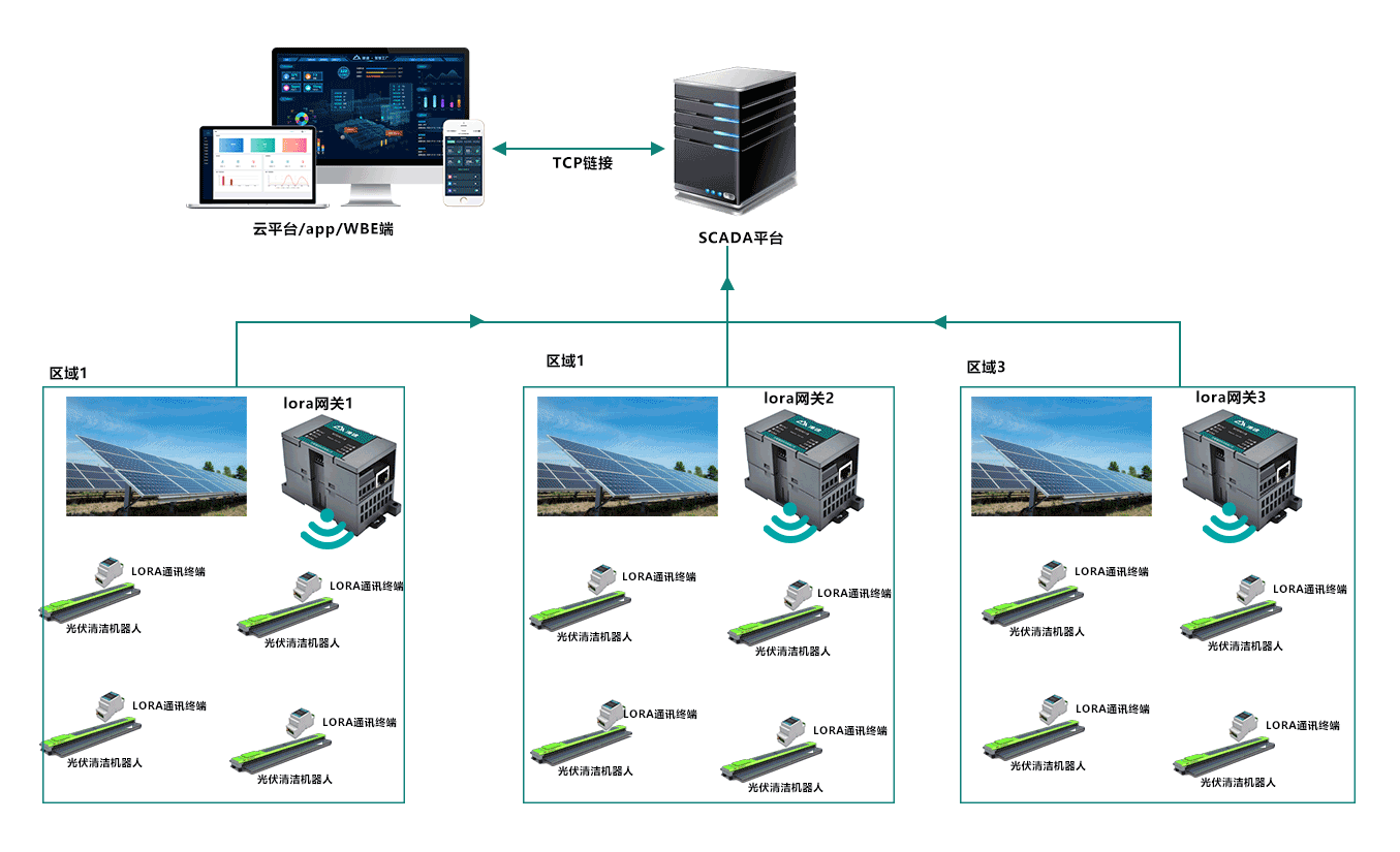 LoRa网关与后台SCADA系统的无缝对接,使得运维人员可以远程对光伏清洁机器人进行参数配置与即时控制,提高了运维的灵活性和效率。
