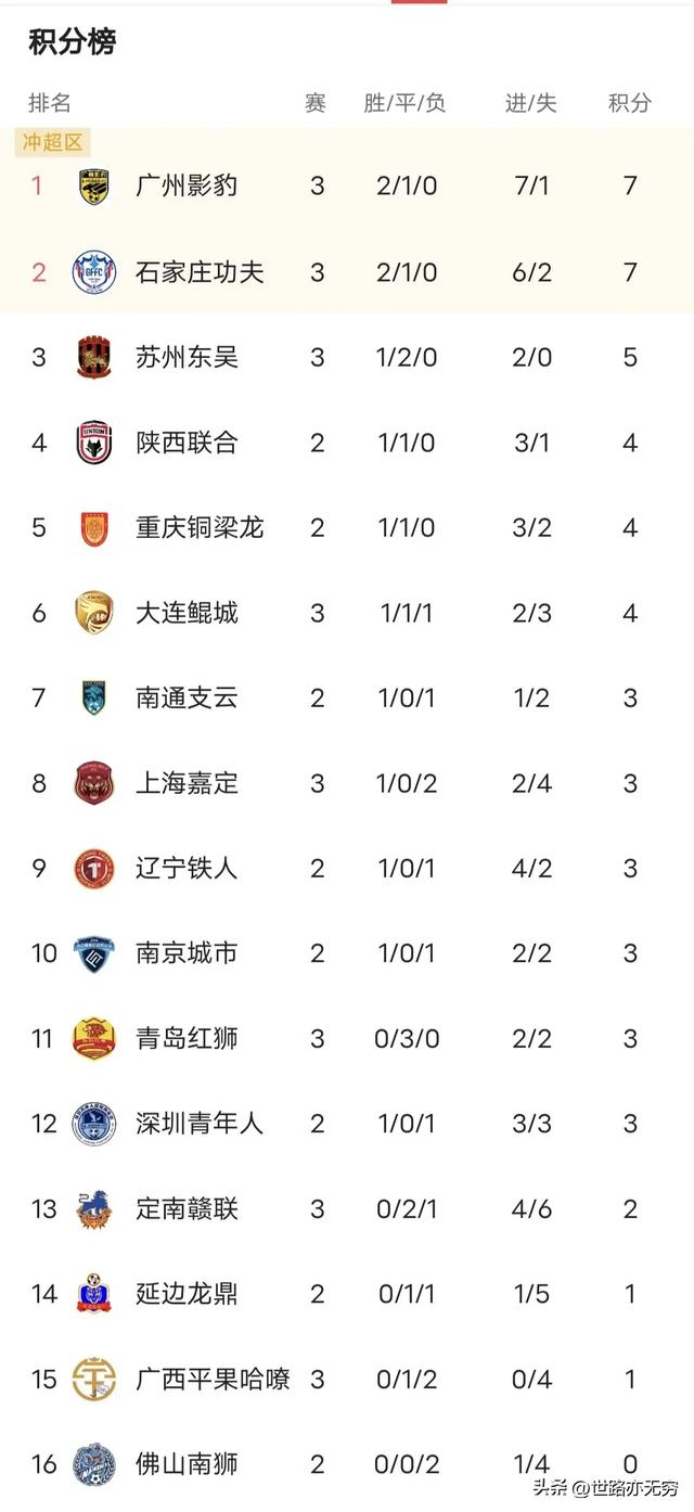 目前,中甲积分榜上广州豹和石家庄功夫同积7分领跑;苏州东吴1胜2平积5分暂列第三;陕西联合和重庆铜梁龙均为1胜1平,因净胜球劣势分别排在第四、五位 。