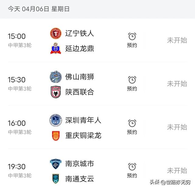 中甲第三轮第二比赛日将于今天(4月6日)展开,当天赛程如下:15:30,辽宁铁人主场迎战延边龙鼎;15:30,佛山南狮主场对阵陕西联合;16:00,深圳青年人主场迎战重庆铜梁龙;19:30,南京城市主场对阵南通支云。各队都渴望在比赛中取得理想成绩,球迷们也期待着更多精彩对决。