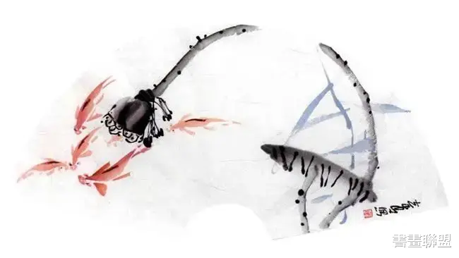 第二步:朱砂、胭脂画小鱼,莲蓬为主,画小叶和芦苇为辅,构图简洁,以小见大。