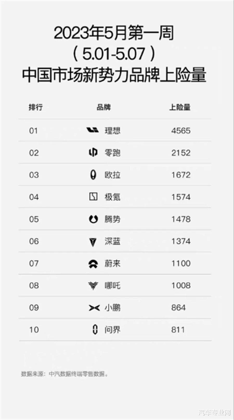 而在5月第一周(2023年5月1日-5月7日)中国市场新势力品牌上险量显示,排行第一的品牌是理想,上险量4565辆,远超上险量第二名的零跑。在这张图片里,数据来源显示为中汽数据终端零售数据,蔚来以1100辆排在第七名,小鹏以864辆位列第九。发布这份榜单是汽车洋葱圈制片人张辰,张辰认为上述数据没有问题,“但不方便说是哪家统计的,不然可能又被投诉举报”。