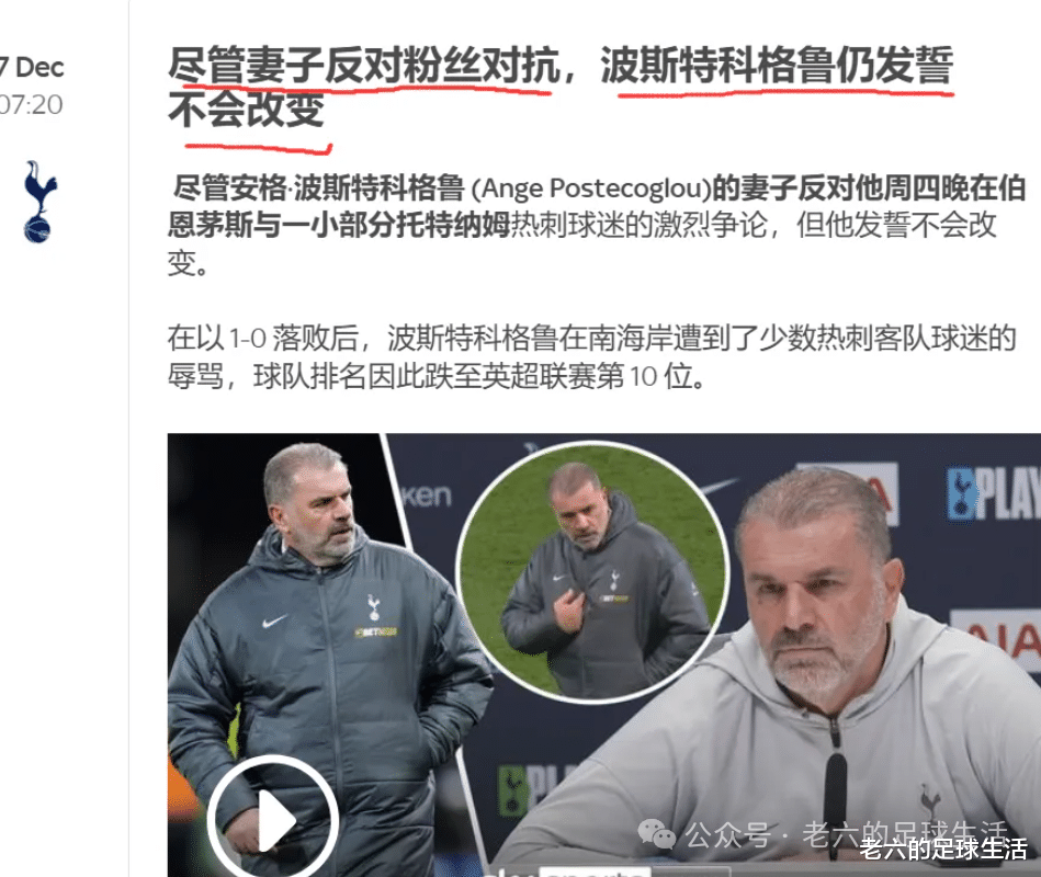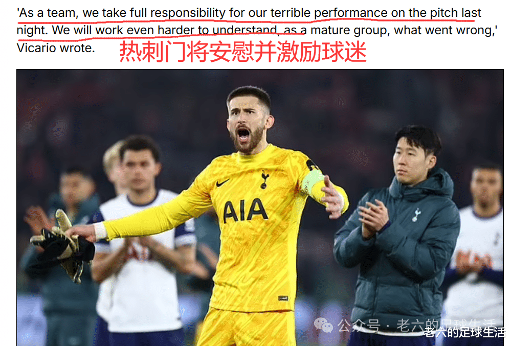 在与阿尔克马尔的赛后,门将韦卡里奥跟热刺球迷们交流,希望能安慰并激励他们,可他的操作也是适得其反,球迷们骂得更凶了,甚至连他也一块骂了,他只好愤然离场,第二天他就发了个道歉帖也给球迷们低头了。