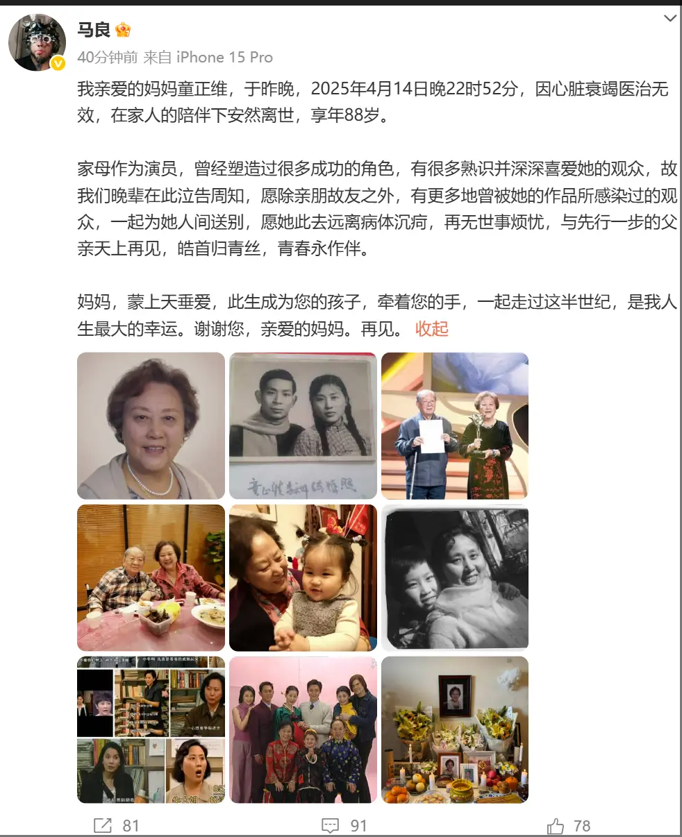 近日,演艺圈传来一则令人痛心的消息,著名演员童正维因心脏衰竭医治无效去世,享年88岁。这一消息由其子马良在4月15日透露,引发了广大观众和业内人士的深切哀悼。童正维老师以其精湛的演技和深入人心的角色塑造,成为了无数人心中的经典。