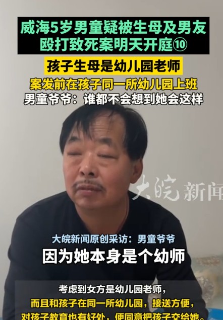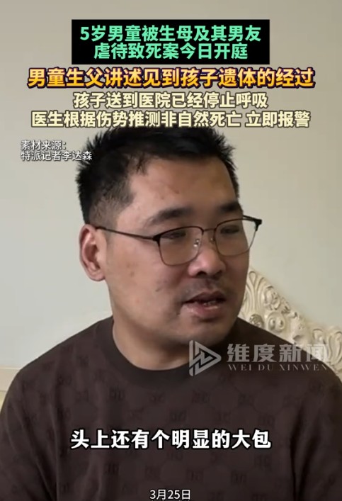 信息来源:维度新闻 2025年3月25日——3月25日山东威海,5岁男童被生母及其男友虐待致死案今日开庭,男童生父讲述见到孩子遗体的经过