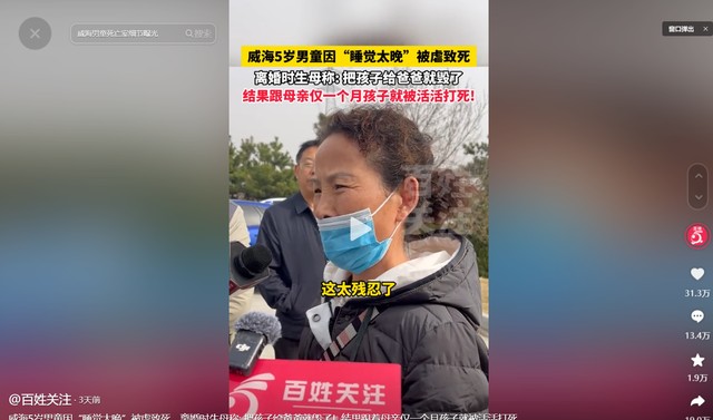 信息来源:百姓关注 2025年3月25日——威海5岁男童因“睡觉太晚”被虐致死,离婚时生母称:把孩子给爸爸就毁了!结果跟着母亲仅一个月孩子就被活活打死