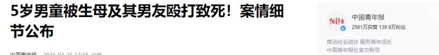 信息来源:中国青年报 2025年3月25日——5岁男童被生母及其男友殴打致死!案情细节公布