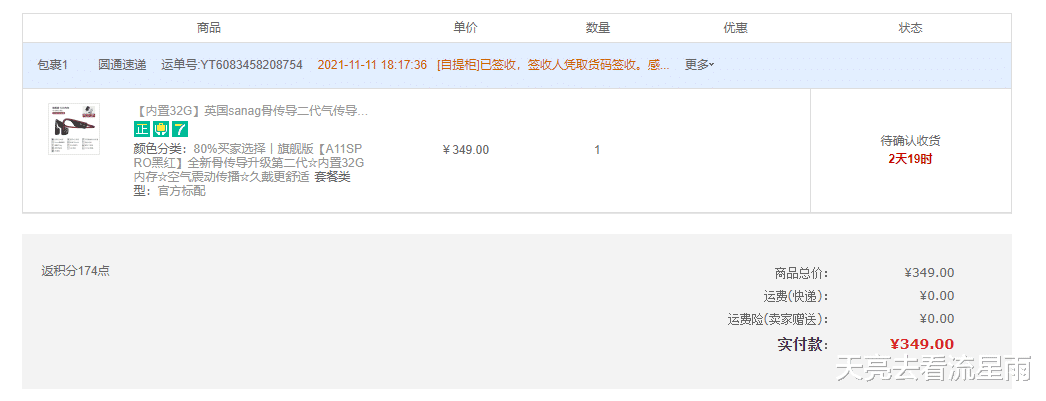 作为一个长期使用骨传导蓝牙耳机的用户,也是在体验了多款耳机样式之后选了最适合自己的,因为骨传导耳机能让我在享受音乐的同时,即保护了耳朵,又可以留意周围环境确保安全。不过骨传导也不是没有缺陷,使用中最让人不爽的是在一些嘈杂环境音量开大了会震得耳鼓发麻,不太舒服。双十一临近之际,在网上看到有一款号称骨传导升级之作的气传导蓝牙耳机,价格也不贵,抱着尝鲜的心态入手了一个,11月8号下的单,11月11号晚上收到货开始体验。