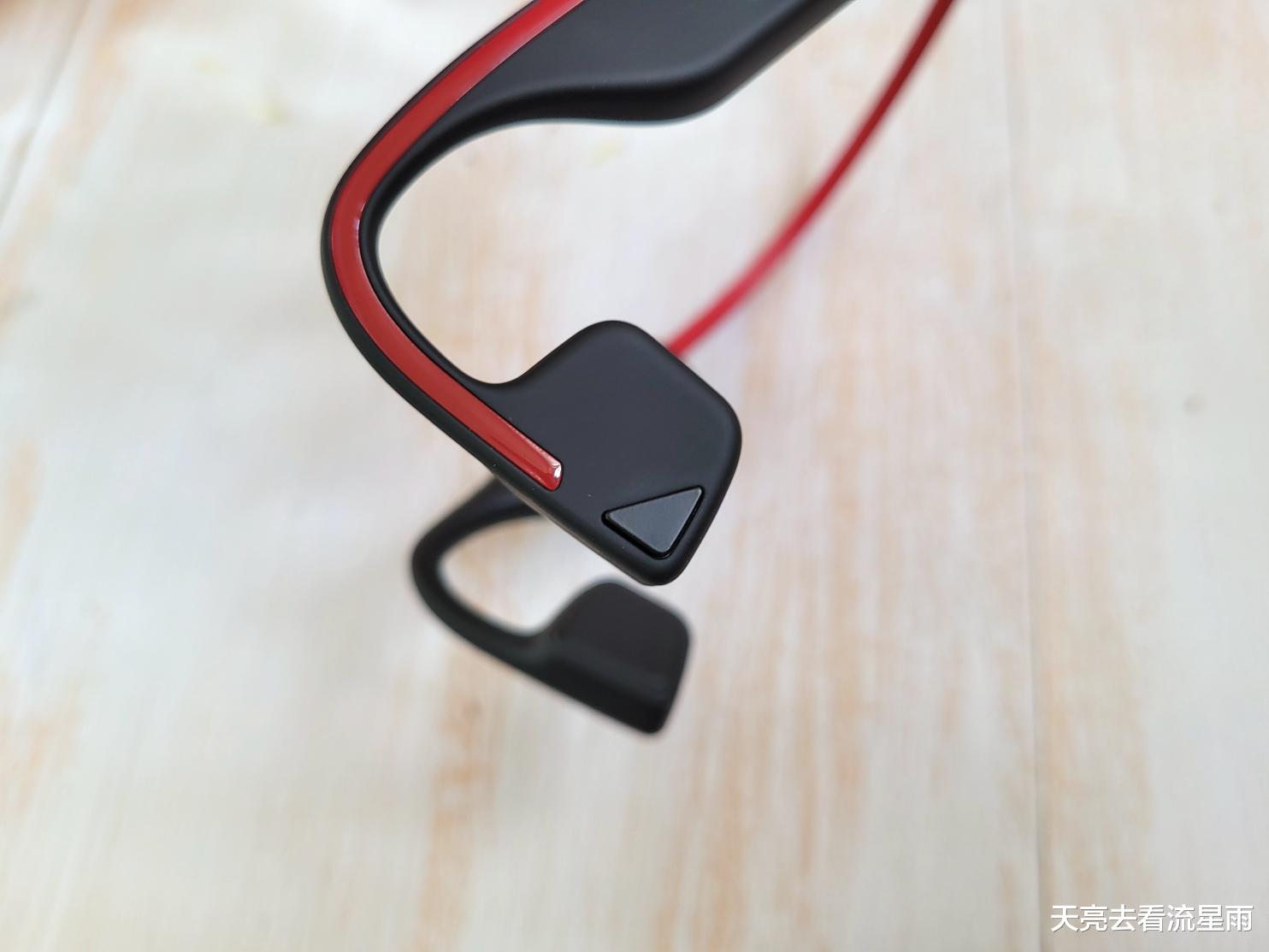 耳机听筒部分方形设计,左侧听筒外侧有一个三角形功能按键,两个听筒的后侧是喇叭初音孔。气传导技术主要也是利用的这里,通过空气震动精准定向传播声音,使得声音传送更加集中,有效防止漏音现象。