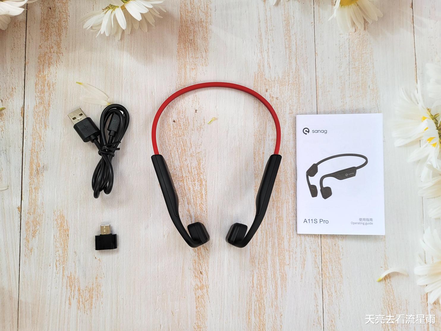 SANAG A11S Pro气传导耳机有黑、白、黑红三种配色,我入手的黑红色款。产品的包装盒整体以黑色色调为主,正面的耳机示意图没有对应黑红色,用的是黑色款。开盖后A11S Pro的黑红配色比较映衬“秘境寒鸦”这个名字,是我喜欢的配色。配件上没有配备隔音耳塞,但是另配了个TYPE-C转接头,就是可以直接把耳机连接到手机上,从手机上往耳机里拷歌。