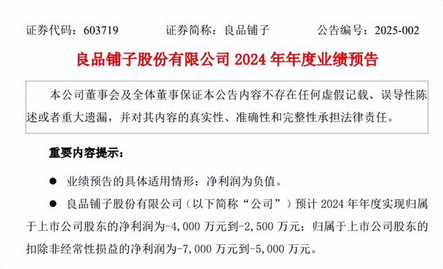 1月17日,良品铺子披露2024年度业绩预告显示,2024年度归母净利润预计亏损2500万元至4000万元,扣非净利润预计亏损5000万元至7000万元。