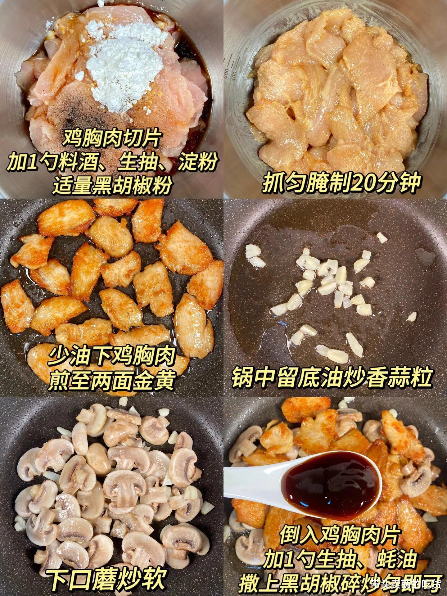 主要食材:鸡胸肉,口蘑,黑胡椒粉,料酒,生抽,淀粉,蒜末,蚝油,这道菜既是家常菜也是减脂餐,正在减肥的妹子们可一定要学会这道菜了。