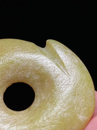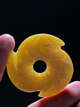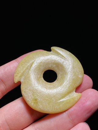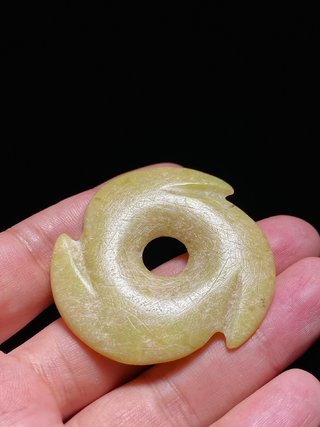 明以前 黄玉 玉璇玑 挂件 把件 长5.3宽5.3厚0.6厘米 重19.8克 此枚璇玑地方黄玉材质,质地细腻温润。整体扁平近圆形,中央有圆孔,形似变形的玉璧。外缘有三个形状相同、且均向同一方向旋转的齿状凸翼,饱满而圆浑,其中一段以细阴线雕刻鹰纹纹饰。源出《尚书•舜典》:“在璇玑玉衡,以齐七政”,为古时礼器,传说其象征太阳或者星辰。造型古朴大气、雕琢简练有力,十分适合作为收藏陈设。