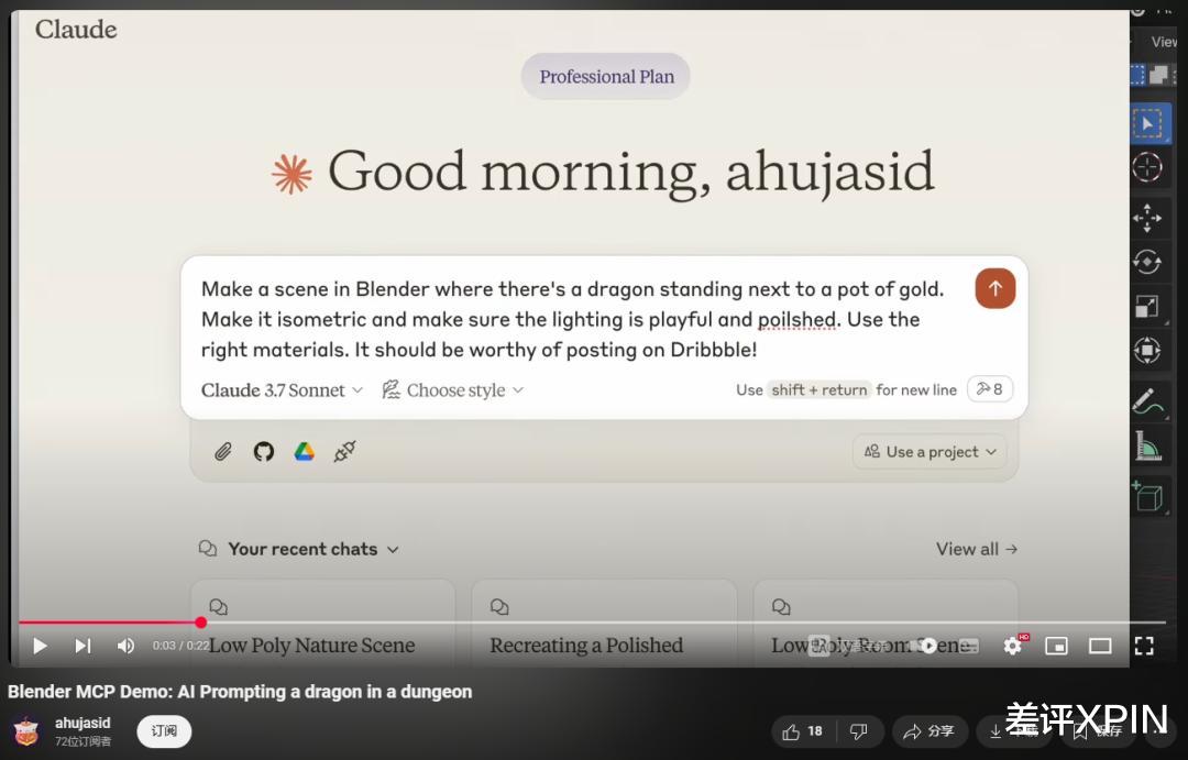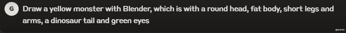 视频里,作者直接在对话框里输入: “ 请用 Blender 帮我建立一个场景,有一条龙站在一罐金子旁边 ” 。