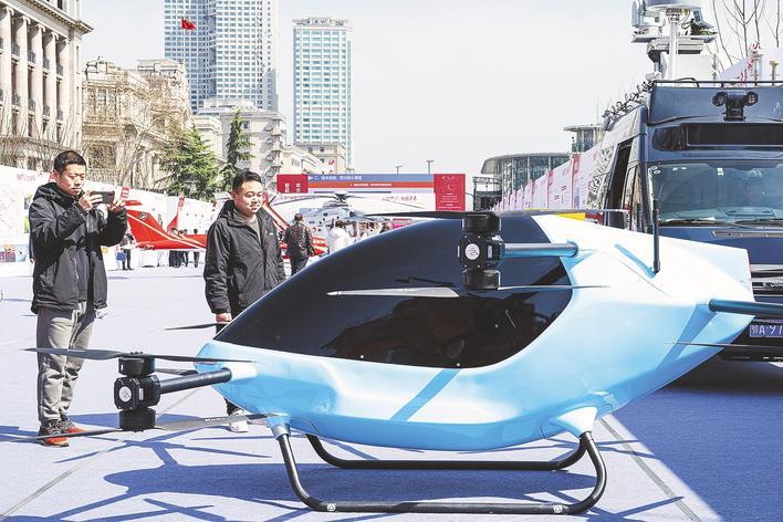 3月18日,武汉低空经济新品发布会在江汉关广场举行。是云航空展示的新款无人机吸引与会者的目光。 记者 任勇 摄