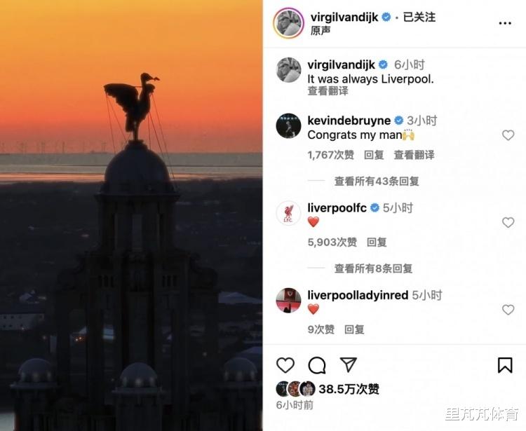 范迪克在社交媒体上宣布自己与利物浦达成续约的。作为英超老对手德布劳内在范迪克的社交媒体上留言表示祝贺的。